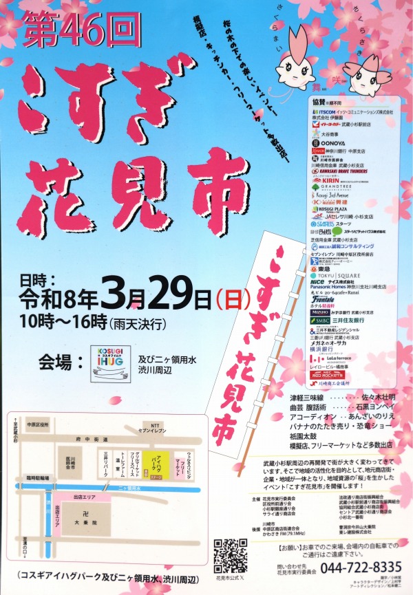 桜の見頃が期待される3月29日(日)10:00~16:00に、武蔵小杉 二ヶ領用水にて地元商店街による「こすぎ花見市」が開催されます。